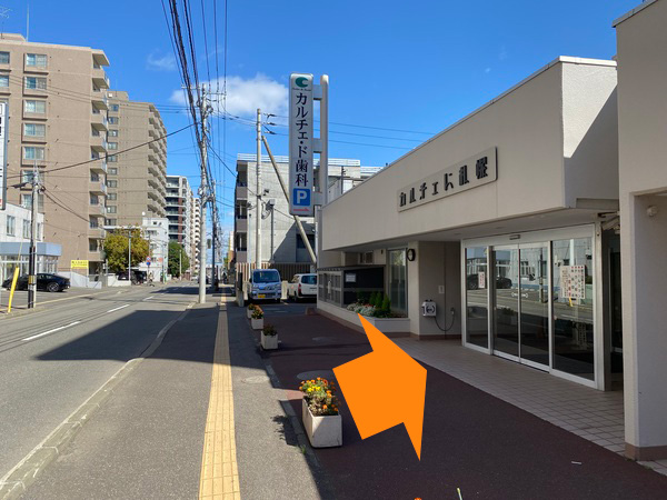 ⑩直進していくと、左手に【カルチェ・ド歯科】の看板が見えてきます。